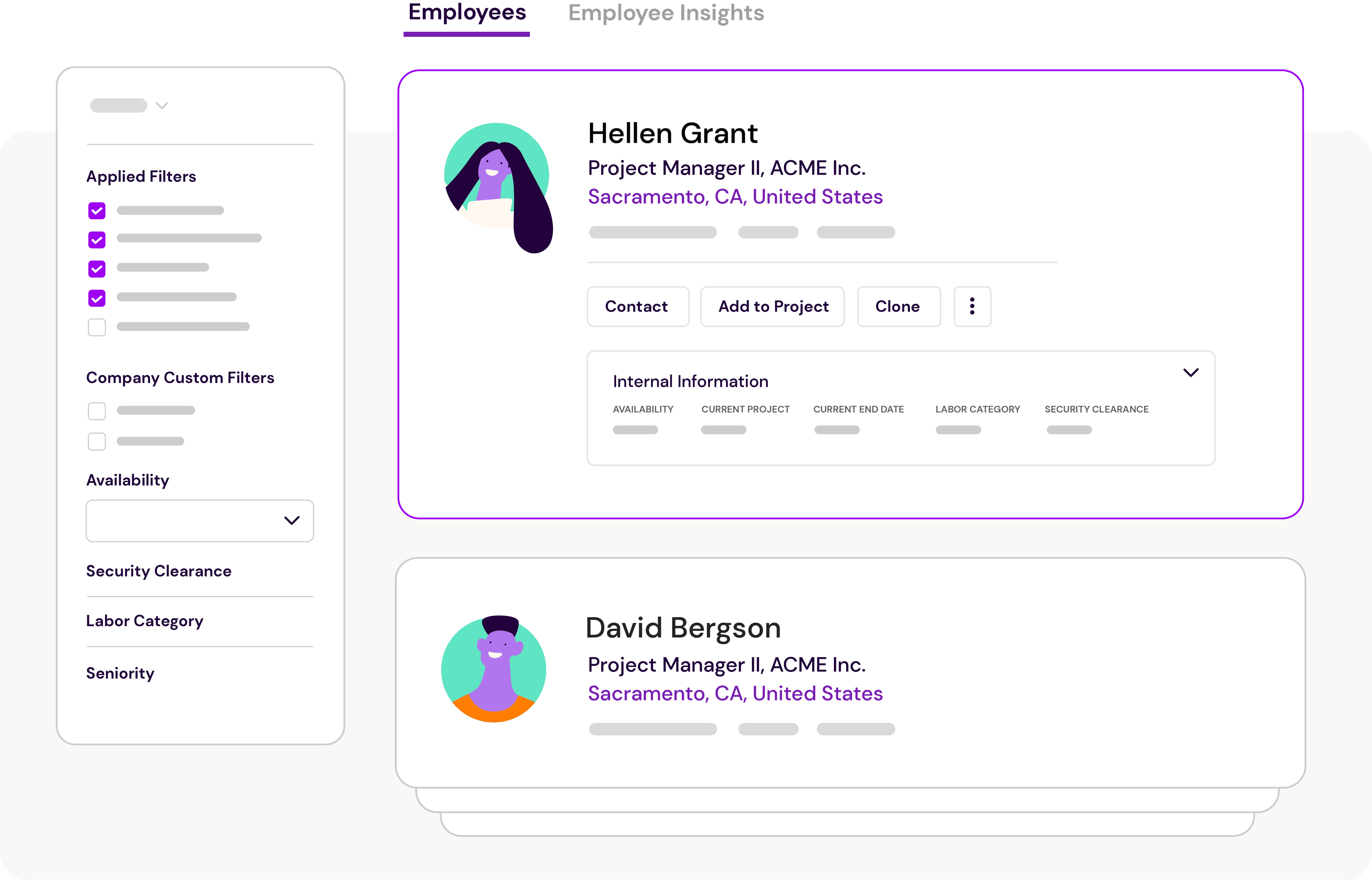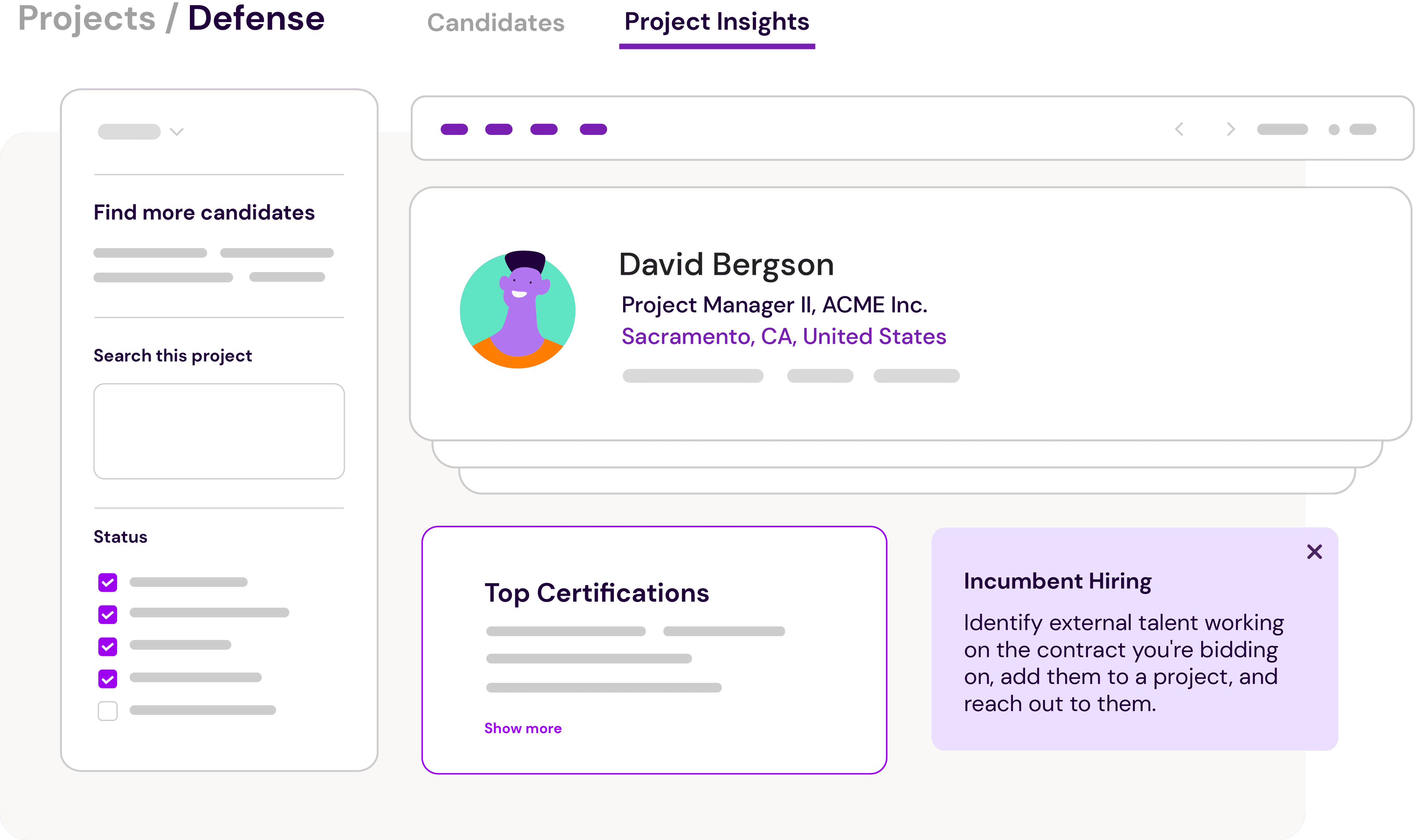 Identify and reach candidates currently working on the contract you're bidding on. Strengthen proposals by identifying internal and external talent with specific contract experience.