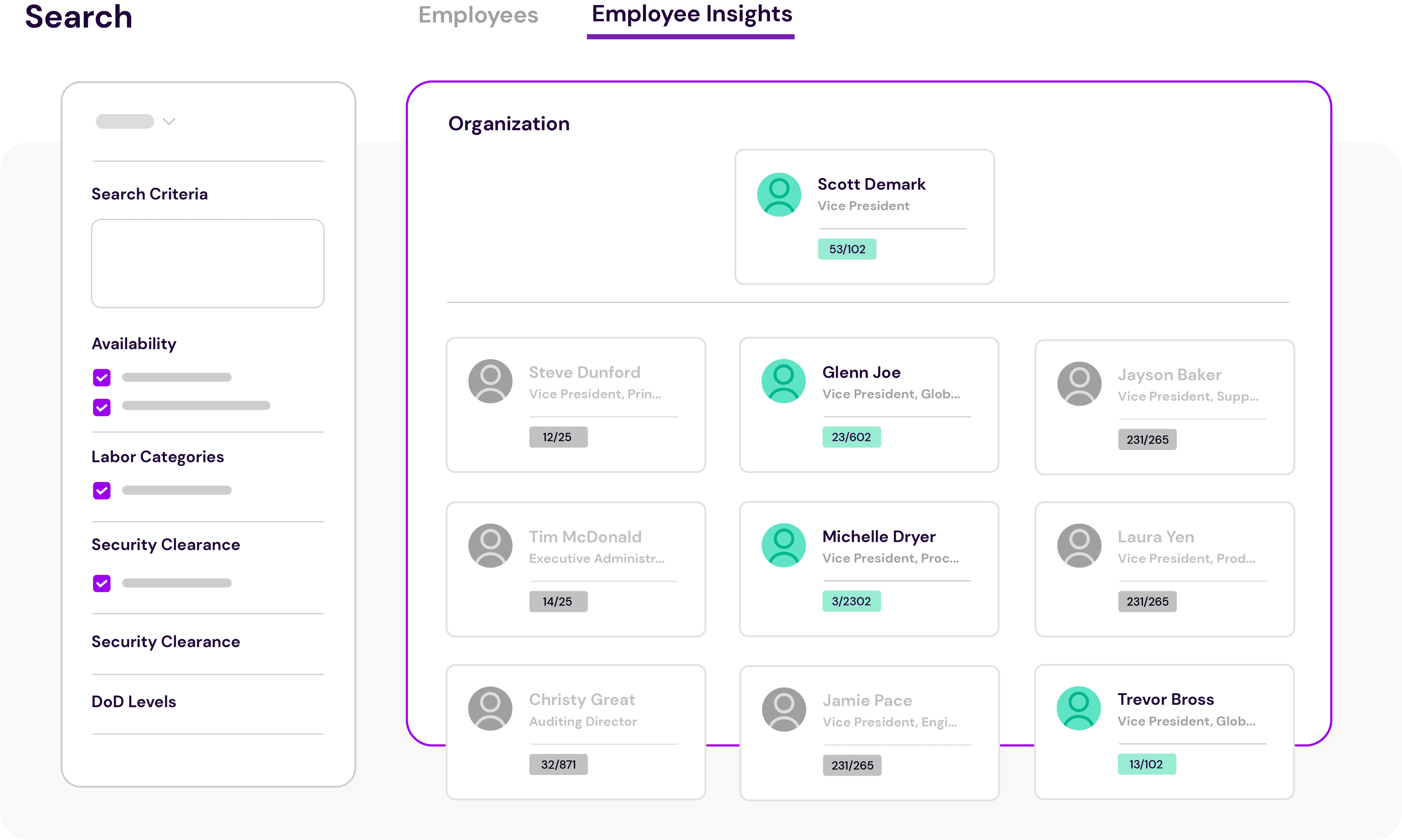 Manage key personnel and top talent on your bench based on their qualifications, clearance, and experience. Minimize downtime and layoffs as a project ends.